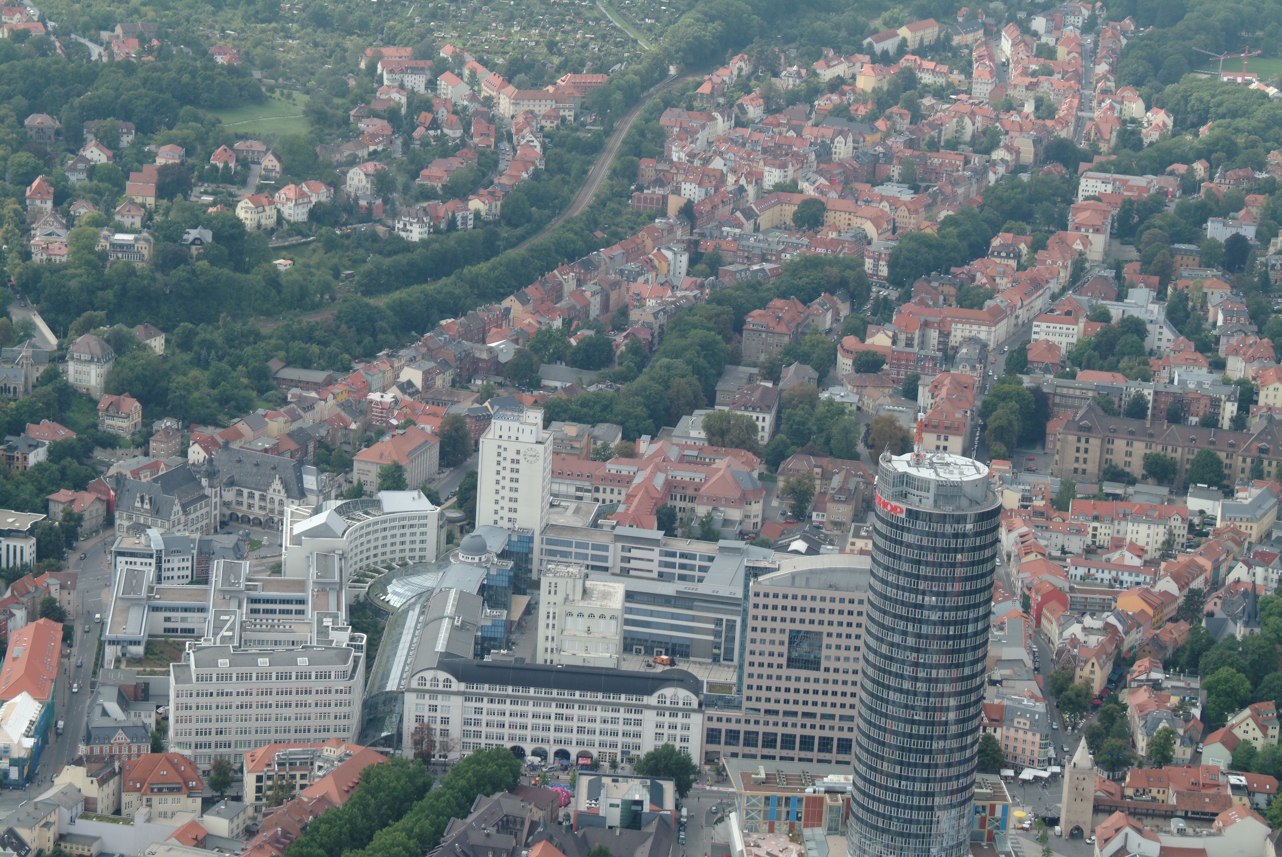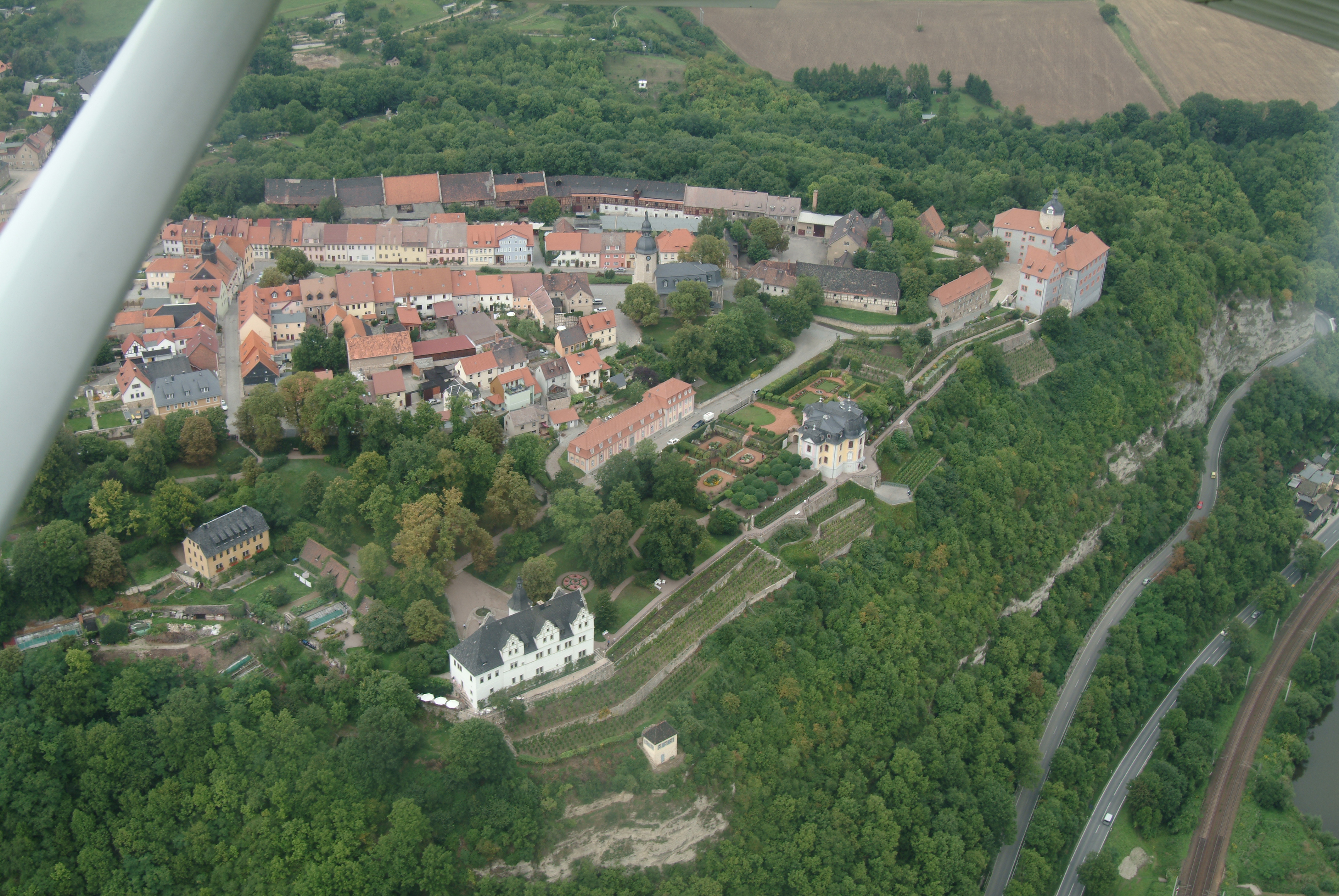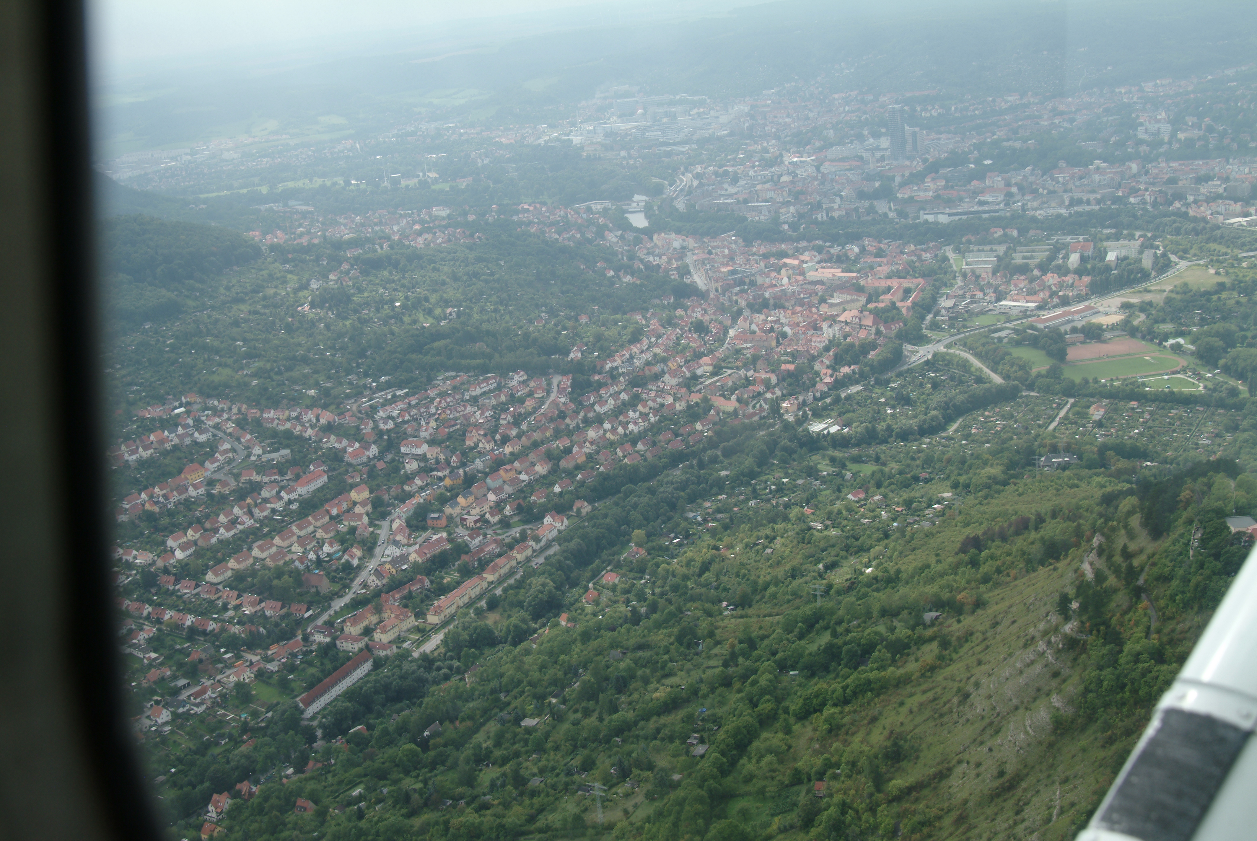 Das Flugzeug startet in Richtung 02 vom Flugplatz Schöngleina – Sie befinden sich noch im Steigflug, wenn Sie rechter Hand die Töpferstadt Bürgel erblicken. Weiter geht es über den Tautenburger Forst mit der Thüringer Landessternwarte Karl Schwarzschild in Richtung Dornburg. Besonders sehenswert sind hier die drei Dornburger Schlösser aus unterschiedlichen Stilepochen, die sich 90 m über die Saale erheben (Renaissanceschloss, Rokokoschloss und Altes Schloss). Das Rokokoschloss diente Goethe im Jahre 1828 als Aufenthaltsort. Mit Südkurs fliegen wir nun über die Universitätsstadt Jena, die reizvoll im Saaletal umgeben von Muschelkalkbergen gelegen ist. Markant sind vor allem in Flugrichtung links der Saale die Kunitzburg, der Jenzig und der Fuchsturm (zwei der sieben Wunder Jenas), der „Intershop Tower“ inmitten der Stadt und rechts der Saale der Jägerberg (ehemals Militärgelände), der Landgraf, Cospeda und das Richtung Weimar gelegene Mühltal. In Cospeda befindet sich die Gedenkstätte 1806, die an die vernichtende Niederlage der Preußen im Krieg gegen Napoleon (Schlacht bei Jena und Auerstedt) erinnert. In Flugrichtung fällt nun die „Königin des Saaletals“, die Leuchtenburg (400 m über NN) ins Auge. Sie stammt aus der klassischen Zeit des feudalen Burgenbaus und ist beliebtes Ausflugsziel für Touristen und Einheimische. Während wir die Leuchtenburg umfliegen, entdecken wir an ihrem Fuße die Kleinstadt Kahla, die unter anderem für ihr Porzellan bekannt ist. Die Leuchtenburg umfliegen wir und nehmen nun wieder Kurs auf den Flugplatz Jena-Schöngleina. Auf dem Weg dahin genießen wir den Blick auf das Thüringer Holzland, das sich als größtes zusammenhängendes Waldgebiet (außerhalb der Mittelgebirgsregion) zwischen Stadtroda, Eisenberg und Gera erstreckt. Wir genehmigen uns noch einen Blick auf Stadtroda (ca. 6600 Einwohner), der Pilot bereitet sich auf die Landung vor und bringt Sie wohlbehalten und hoffentlich voller schöner Eindrücke auf den Boden der Tatsachen zurück.